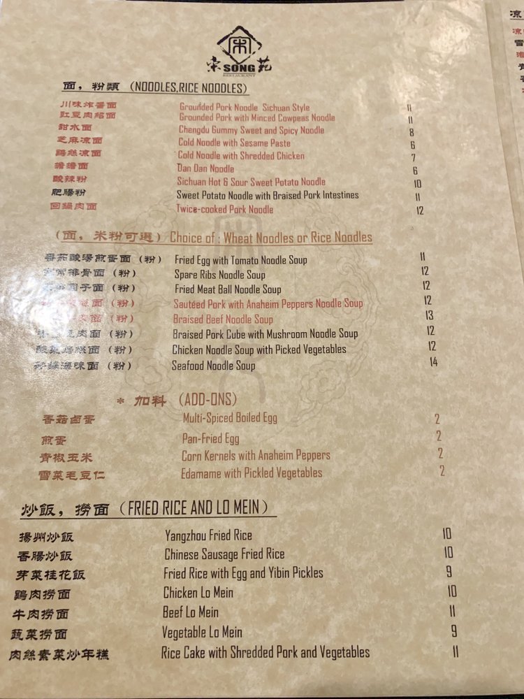 Introducing the menu at Song Restaurant in West Hartford, CT. Known for its authentic Chinese cuisine, Song Restaurant offers a variety of dishes including crispy pork nuggets, avocado shrimp, steamed pork dumplings, pork and lamb roujiamos, beef lo mein, cold jellyfish, scallion pancake wrapped with braised beef, Chengdu wontons, and Dan Dan noodles. Customers rave about the flavorful dishes and generous portion sizes at reasonable prices. The restaurant provides a trendy and intimate dining experience with options for vegan and vegetarian diets. Whether you're a fan of noodles or Asian snack foods, Song Restaurant is a must-visit spot for delicious and authentic Chinese dishes. Stop by for lunch or dinner, and don't forget to try the Braised Beef Noodle Soup or the shrimp lo mein for a satisfying meal.